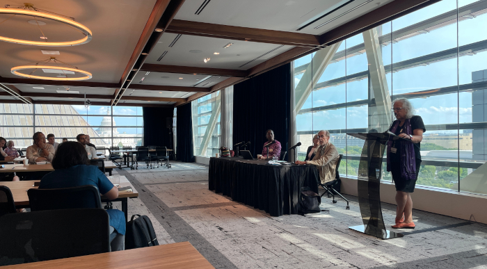 Conference host Beverly Silver aan het woord, met het Capitol op de achtergrond (foto Amsab-ISG)