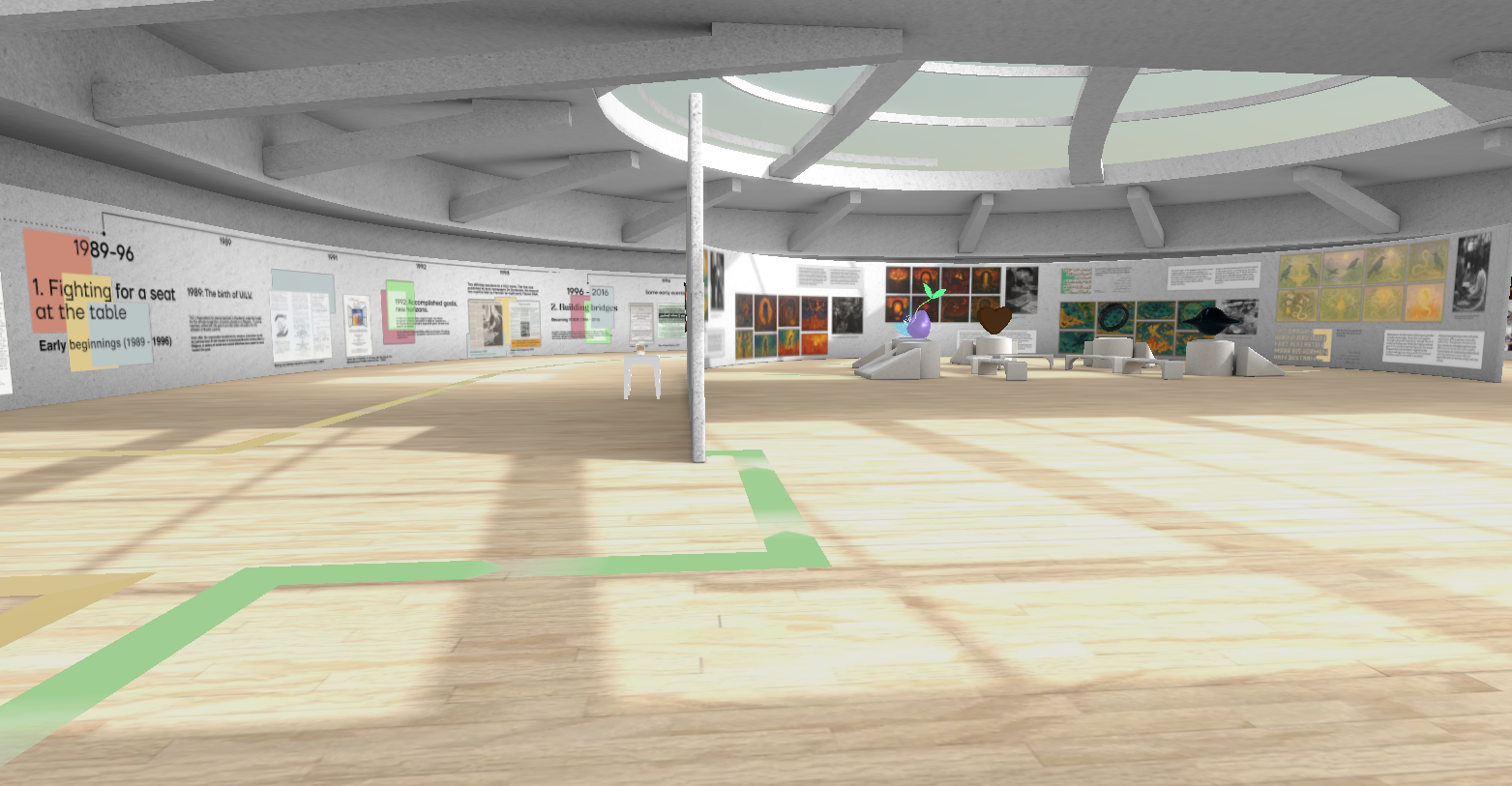 Vandaaruit kan je gemakkelijk doorwandelen naar de tentoonstellingsruimte, waarbij strepen op de vloer de weg helpen aangeven. Wie dat wil, kan ook een achterdeurtje nemen rechtstreeks naar de tentoonstellingen.