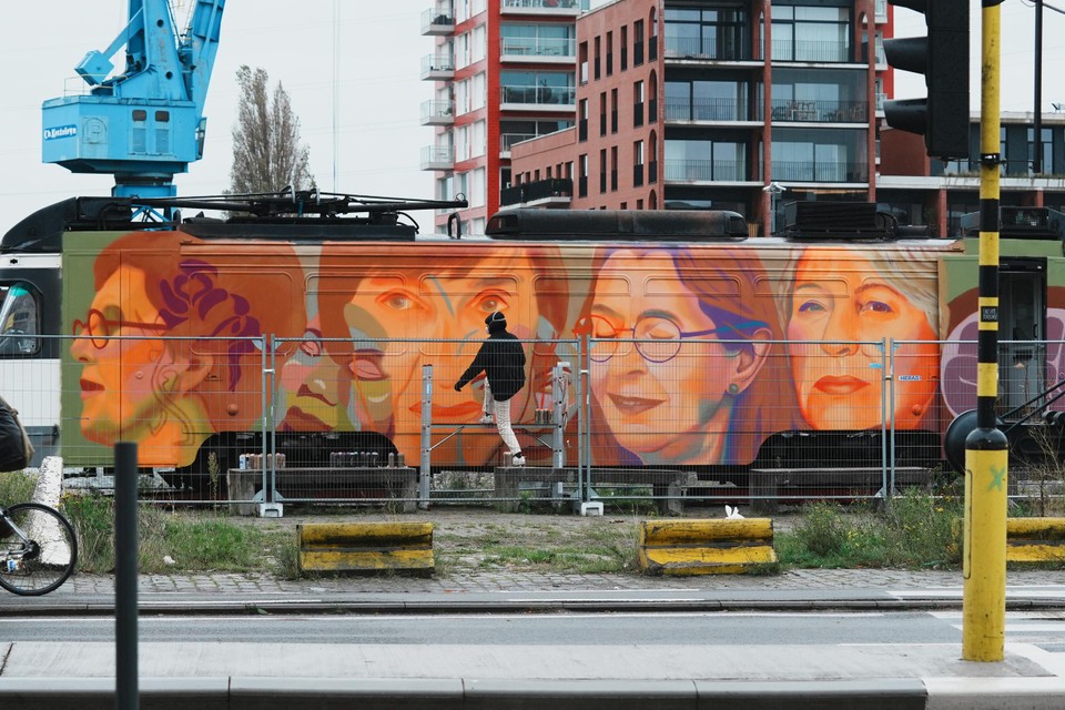 Kunstenares Alice Martha schilderde op een oude tram in Gent de gezichten van negen feministische Gentse vrouwen. Ze kwam langs bij ons voor informatie over een aantal vrouwen, van wie wij de archieven bewaren.